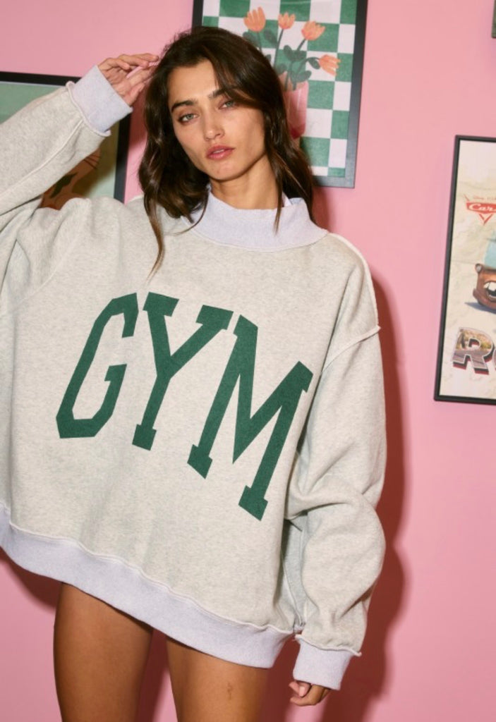 'GYM & BED' Print Reversible Mockneck Sweatshirt - Mock-neck - Drop shoulder, long sleeves - Softest cozy fleece - Oversized fit - Rib banded hemline and cuffs - The reversible design lets you switch up your style. ** The pants made with the same fabric as this design, and that can be worn as a set, are styles IP5425-2 & IP5729 **