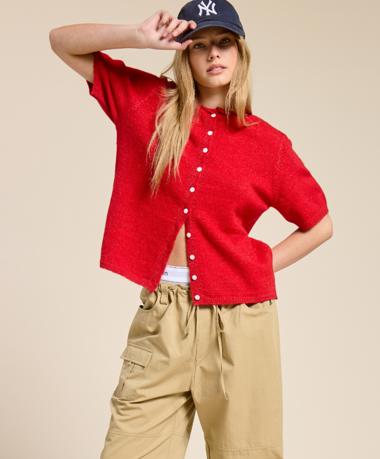 This short sleeve cardigan reimagines our bestselling MK7091 cardigan in a breezy silhouette made for year-round wear. It features a button-down front, relaxed fit, and subtle ribbed edges for a polished finish. Lightweight yet cozy, it's perfect worn on its own as a top or layered over tanks and dresses. An everyday staple designed for effortless wear through spring, summer, and beyond. 61%POLYESTER 15%ACRYLIC 15%NYLON 6%WOOL 3%SPANDEX
