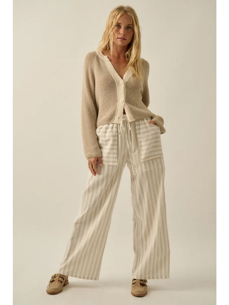 A pair of striped, woven cotton pants with the following features: Drawstring elastic waist. Front patch pockets. Wide leg. Partial thigh-length lining. Ankle length. Relaxed fit.