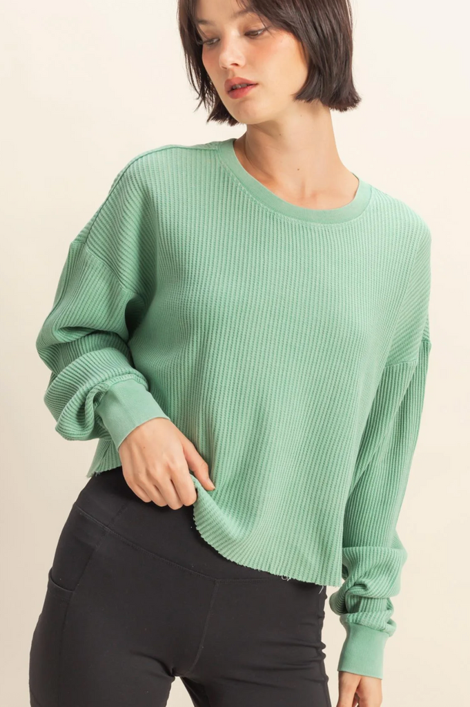 Stay Cozy And Stylish With This Waffle Long Sleeve Top. Featuring A Relaxed Fit And Crew Neckline, This Top Is Perfect For Layering Or Wearing On Its Own. The Waffle Fabric Offers Both Comfort And A Trendy Texture, Making It An Ideal Choice For Casual Outings Or Lounging At Home. Pair It With High-Waisted Jeans Or Sweatpants For A Laid-Back Look. v