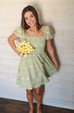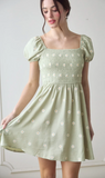 SQUARE NECKLINE SHORT PUFF SLEEVE SMOCKED BODICE A-LINE MINI SKIRT DAISY EMBROIDERY PATTERN NOT LINED 100% POLYESTER